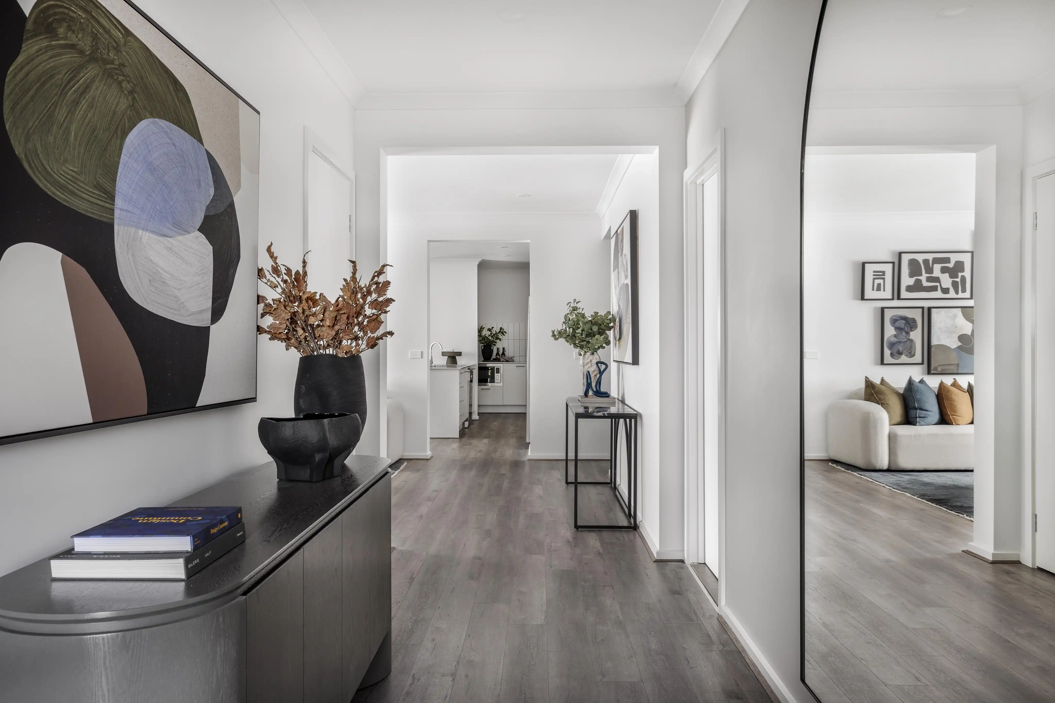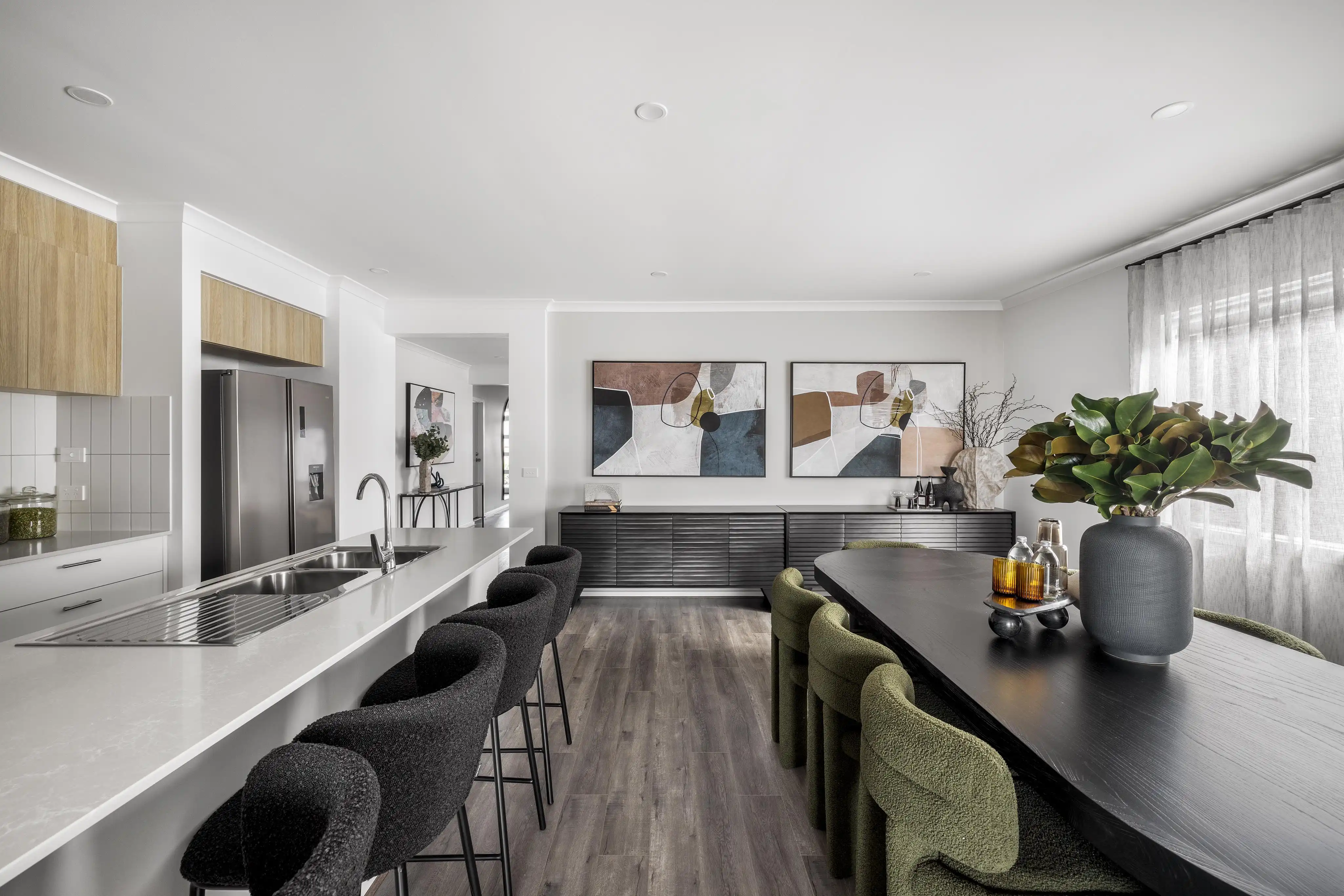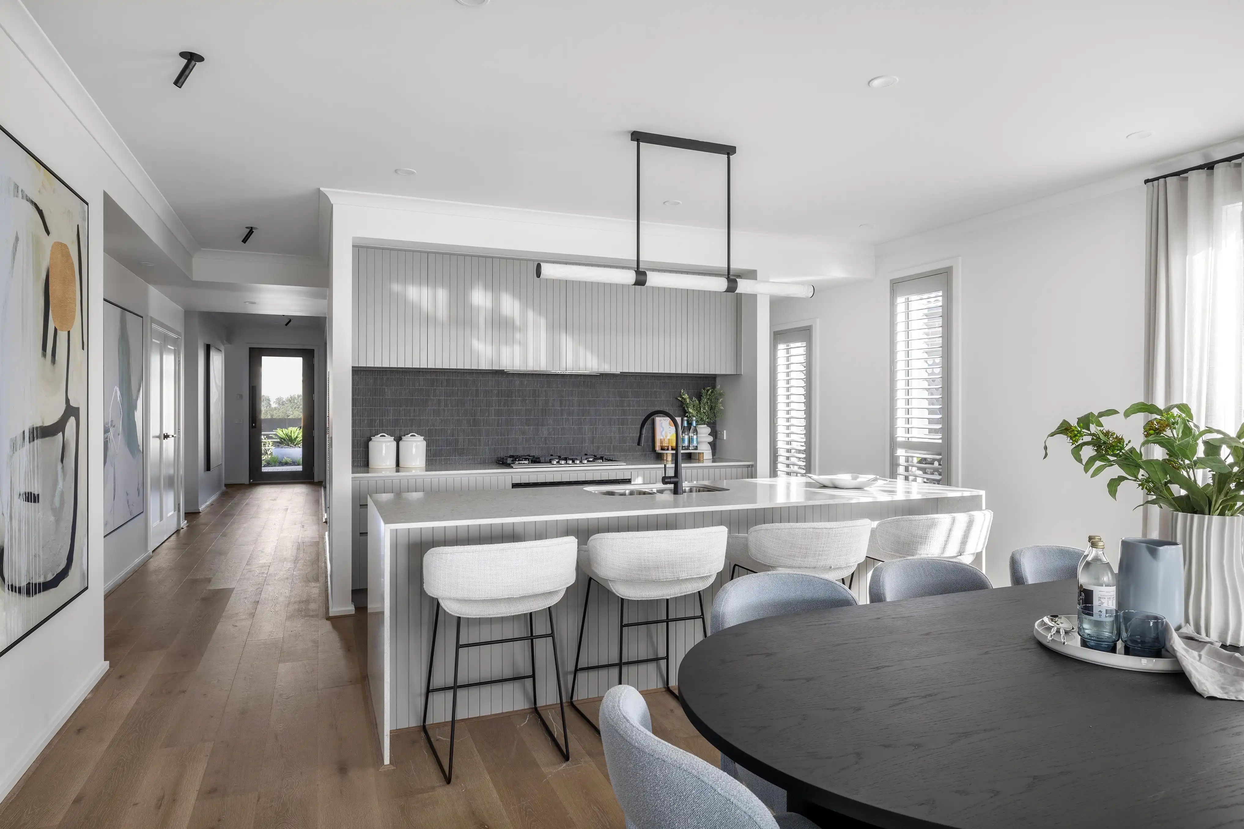 The Fairlight 27 display features contemporary high-end finishes, ideal for families who require more space and distinct zoning between adult and children’s areas; offering privacy and separation within a connected home. The layout of the Hardy 26 home, which incorporates the alternative kitchen structural option, demonstrates the excellent functionality that buyers can expect from this floorplan. For families who appreciate a more compact design without sacrificing comfort, this design delivers shared family spaces and privacy in a well-balanced, light filled home.
