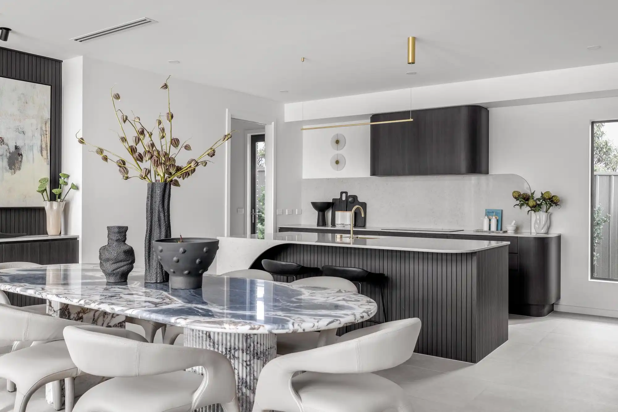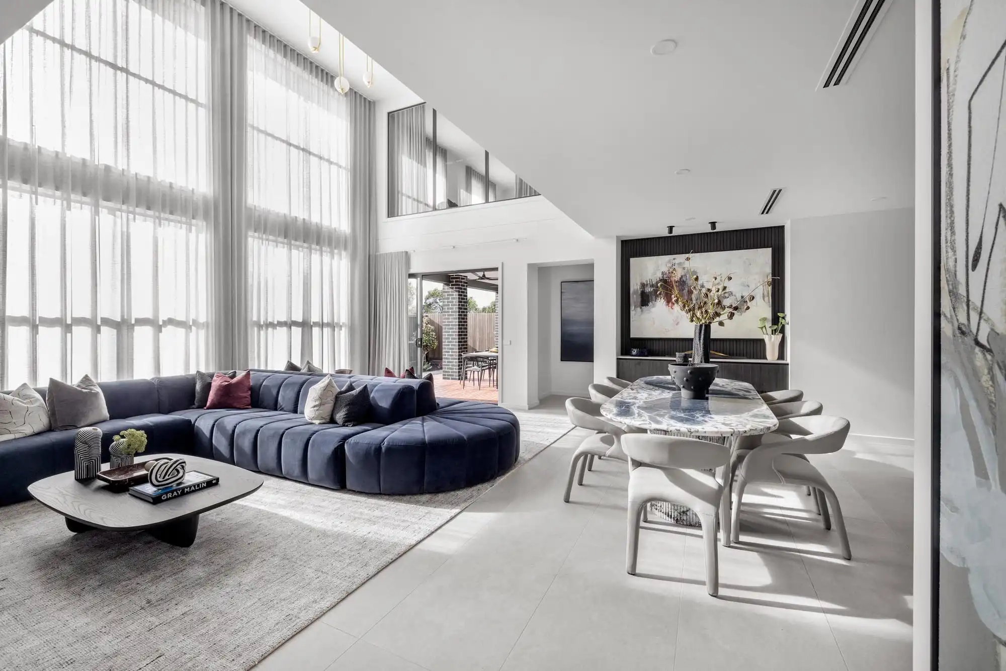 At the heart of the family zone, a sculptural curved couch snakes through the space — a subtle nod to the conversation pits of the 1970s, where entertaining felt both intimate and open. Here, movement between the kitchen, family area, and alfresco is effortless, encouraging connection and flow.