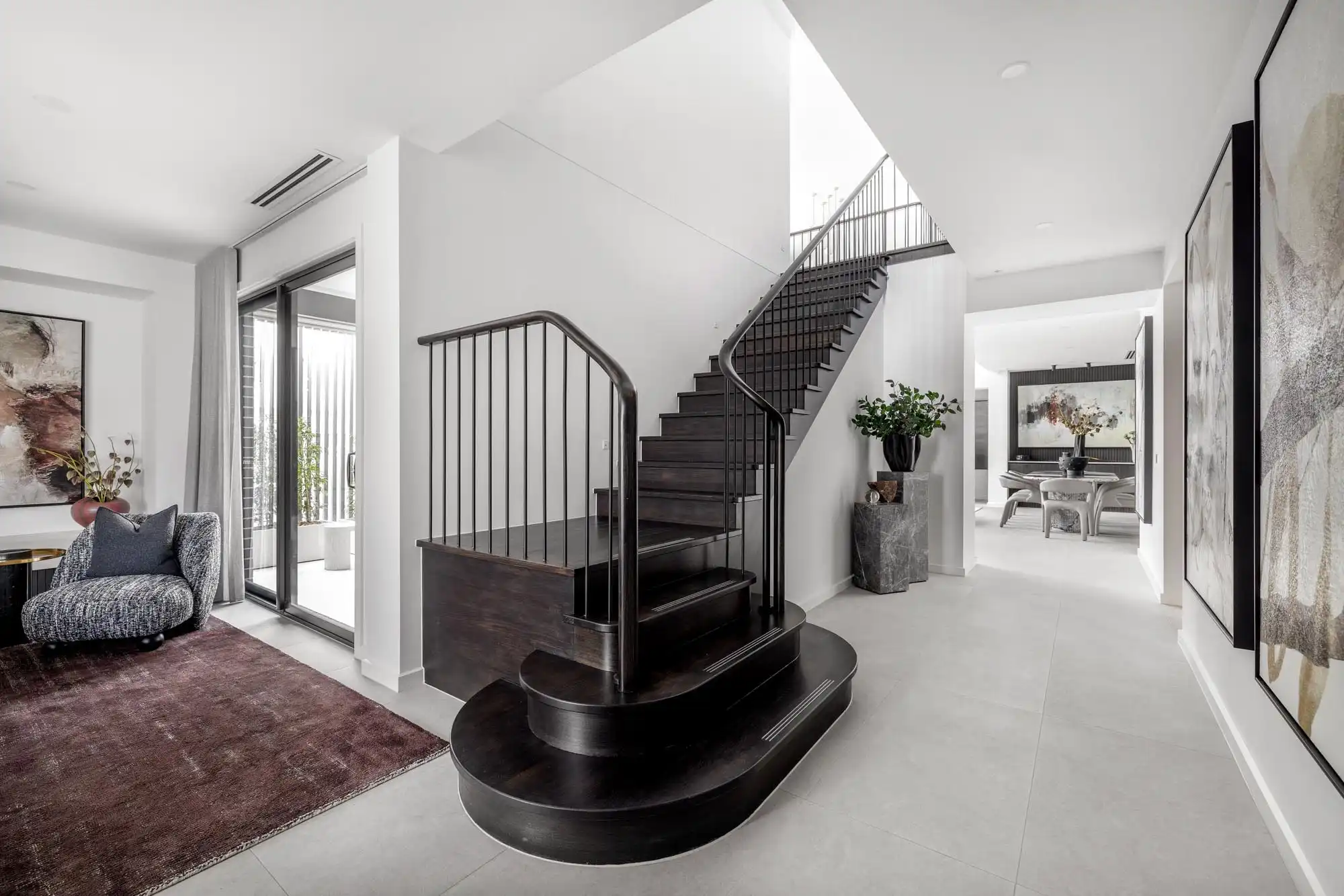 While grand in scale, the Westbrook 54 is grounded by sleek, modern finishes, such as slimline 20mm Caesarstone benchtops, large-format tiles from National Tiles, and a minimalist staircase and balustrade that reinforce its contemporary foundations.