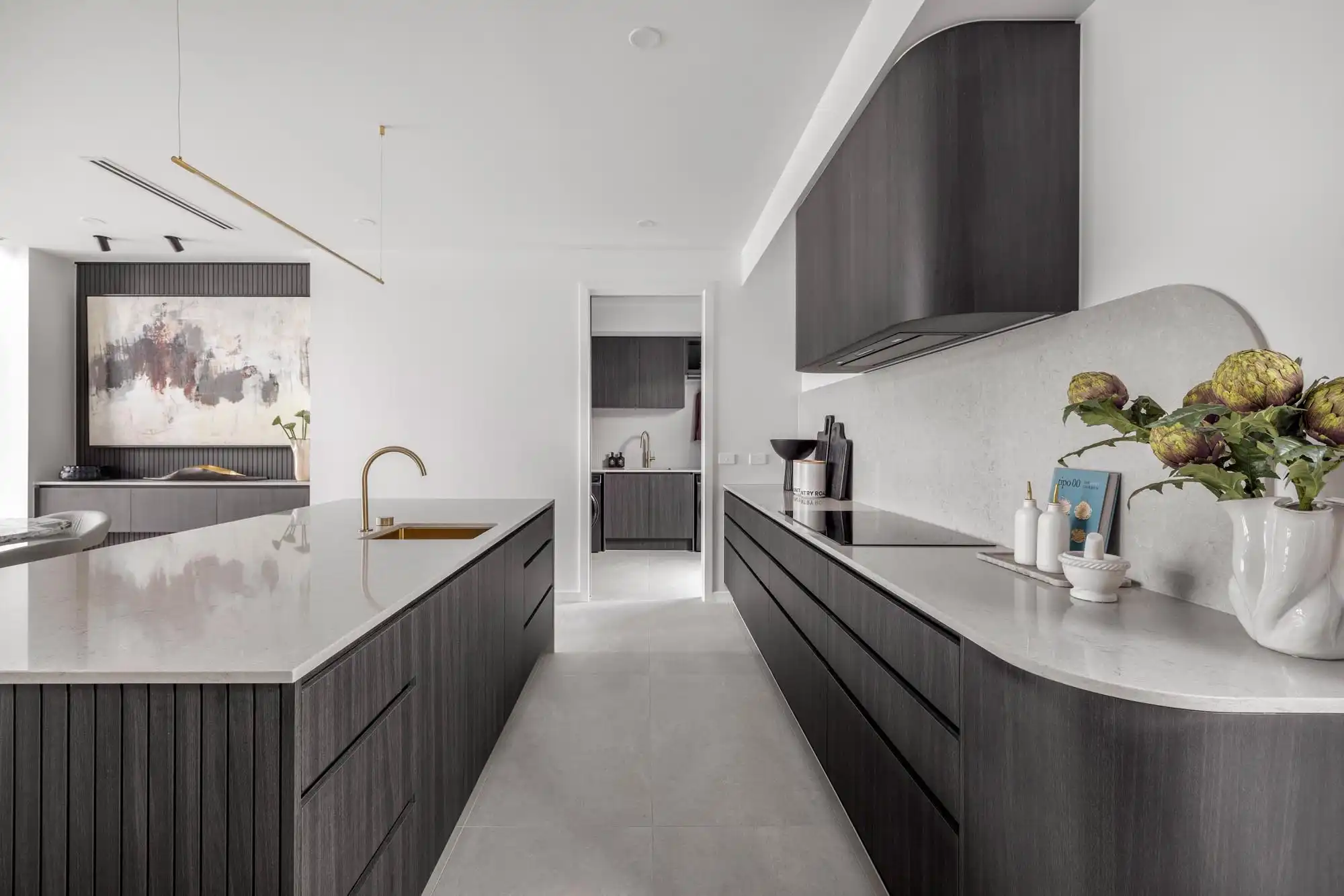 While grand in scale, the Westbrook 54 is grounded by sleek, modern finishes, such as slimline 20mm Caesarstone benchtops, large-format tiles from National Tiles, and a minimalist staircase and balustrade that reinforce its contemporary foundations.