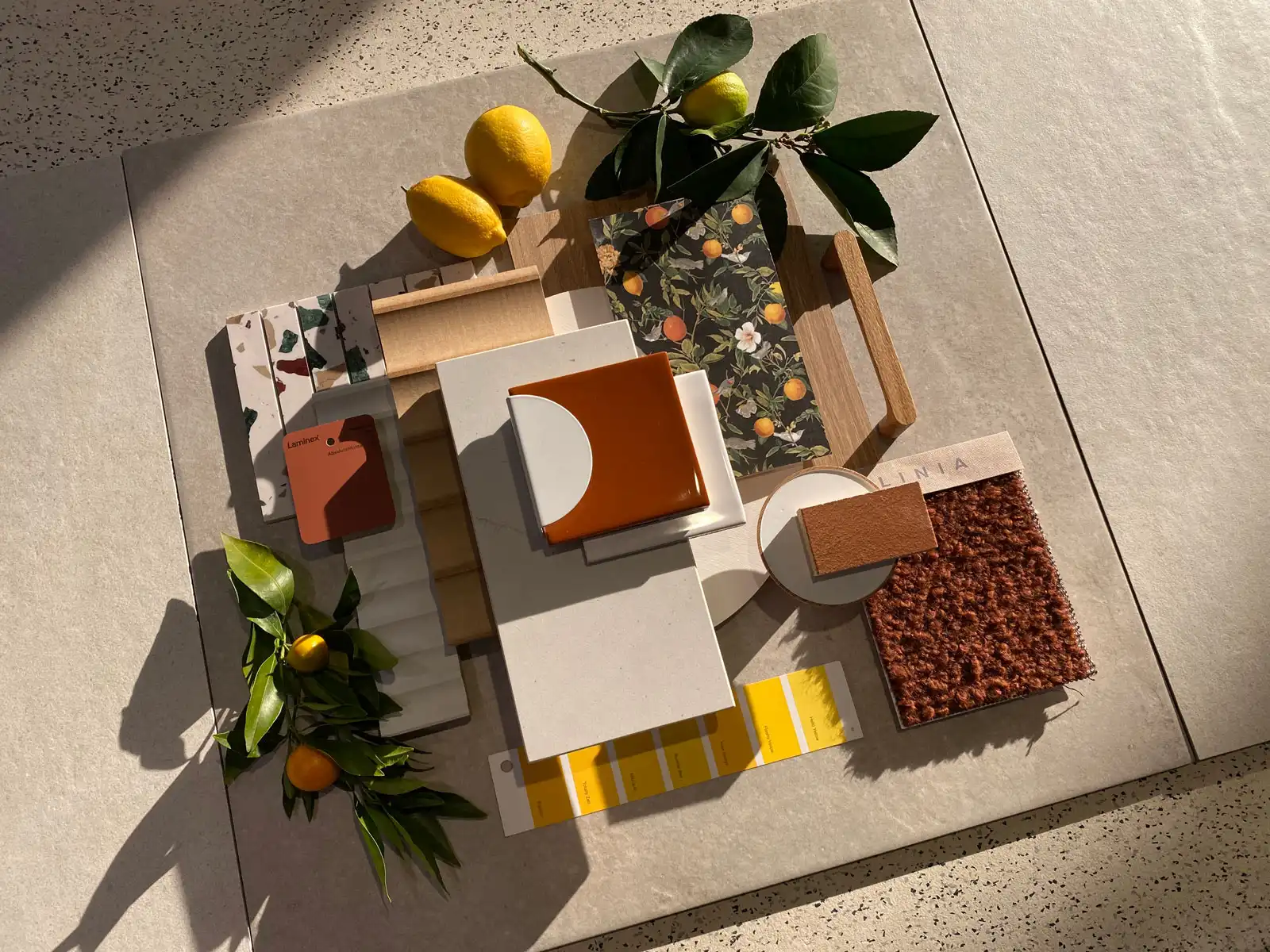 Tiles: Concept Stone Sand Natural 604x604mm, Urban Atelier Castanho Gloss 100x100mm, Urban Atelier Branco Gloss 100x100mm, Riviera Mineral Terrazzo Mosaic. Caesarstone: Fresh Concrete. Laminex: Moroccan Clay (Absolute Matt Finish), Impressions Honey Elm (Chalk Finish).