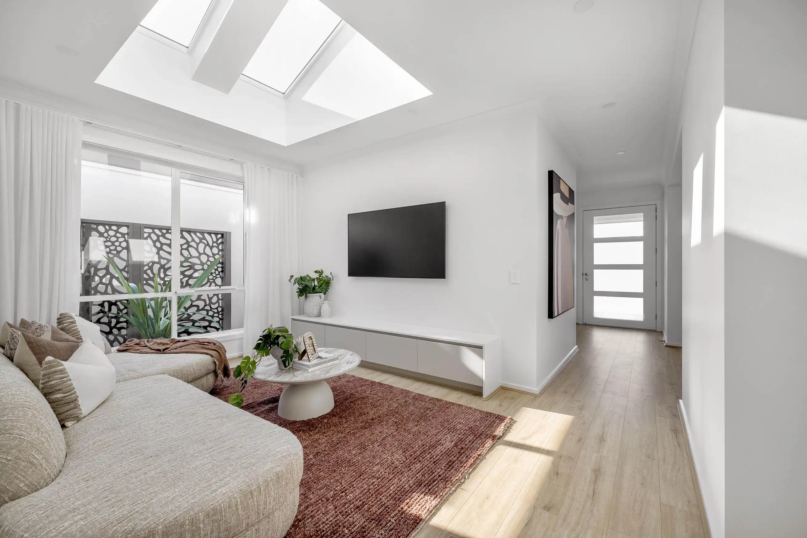 Flexible living zones: Beyond the main living space, the Olivine 23 includes a separate media room framed by large skylights above, offering versatility — whether that’s a quiet retreat, a home office, kids’ playroom or movie nights.