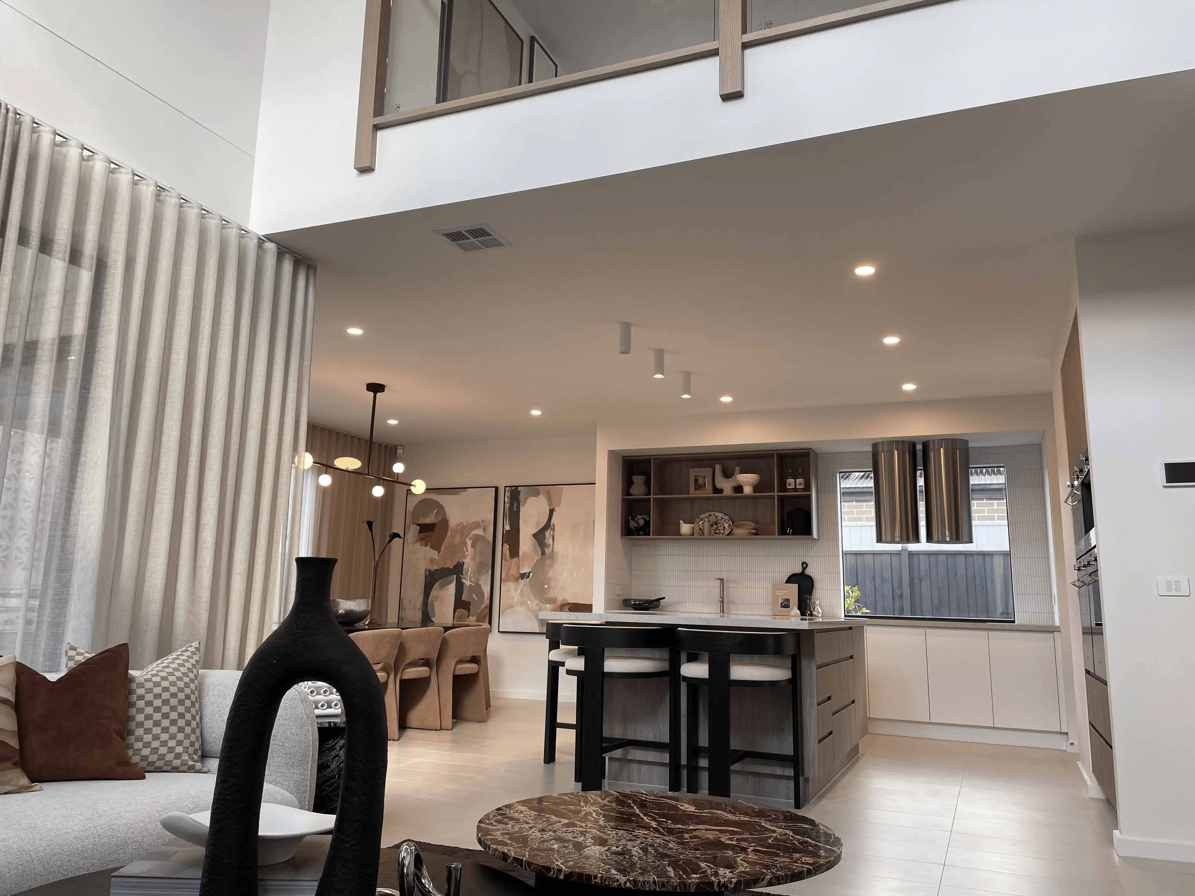 Designed for customers seeking the flexibility of a larger home, this design offers standout features including a striking rear void between floors, a front sitting room with nearby powder room, an oversized butler’s pantry suitable as a second kitchen, an extended island bench, and smart zoning for multi-generational living or hosting long-term guests. All achieved on a 14-metre wide block, while maintaining traditional 9-foot (2.74m) ceilings throughout.