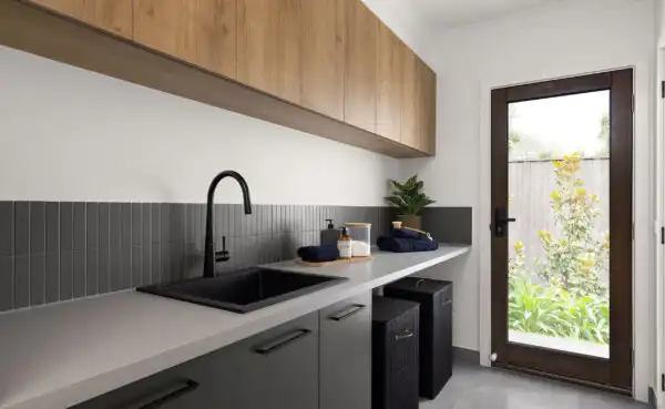 Utilise overhead cupboards to store cleaning supplies out of reach of children, and use multiple laundry bins for sorting lights, darks, and delicates as you go. A clear counter space for folding clothes can drastically reduce laundry time.