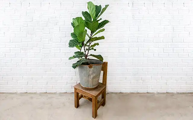 Fiddle Leaf Fig will be happy if it is kept moist in a brightly lit spot, but be sure to keep it out of direct sunlight or its leaves will burn and brown off.