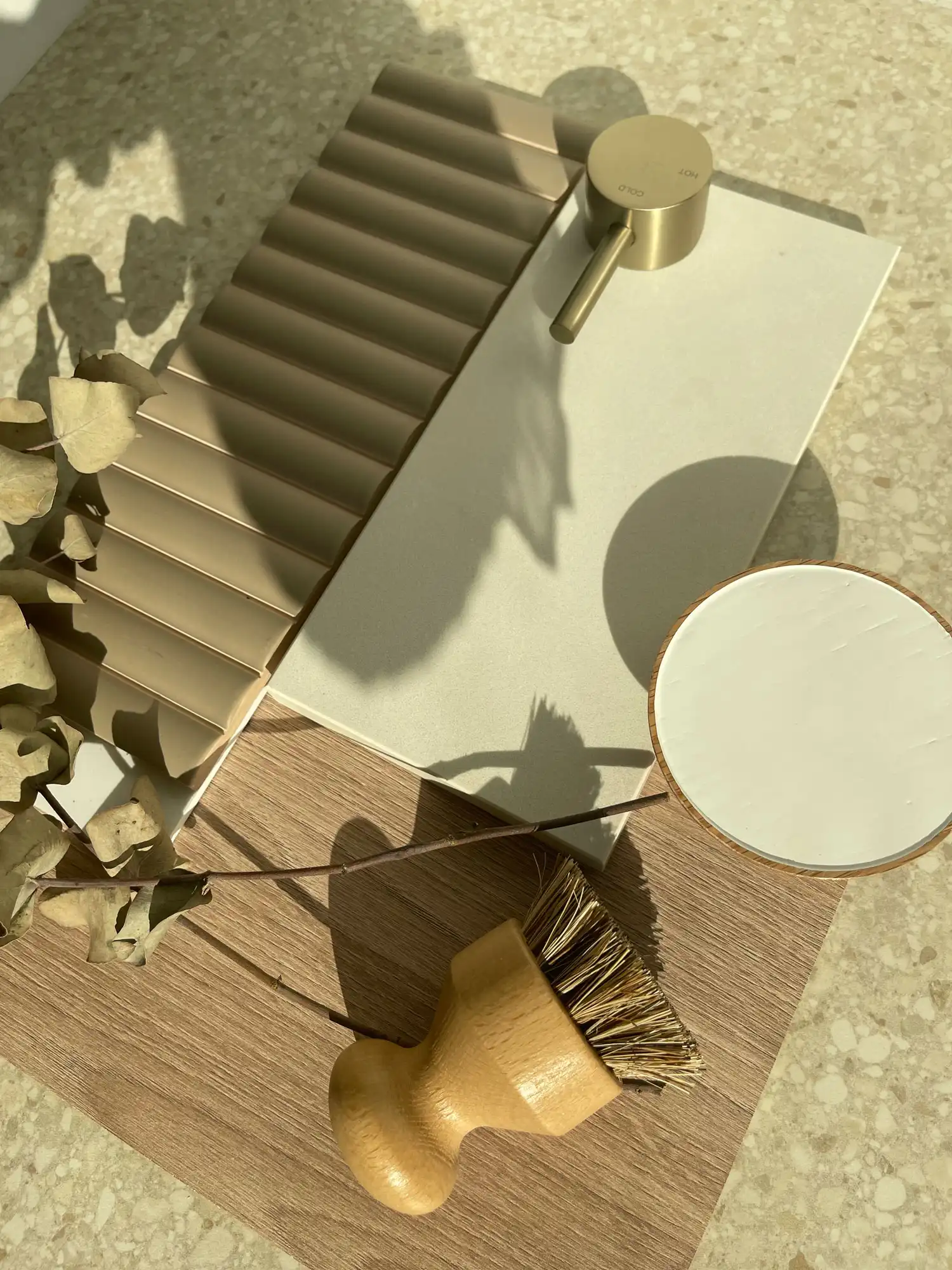 Light to medium timbers, crisp white stone and the timeless look of brass tapware bring out the best of 'Mou'.
