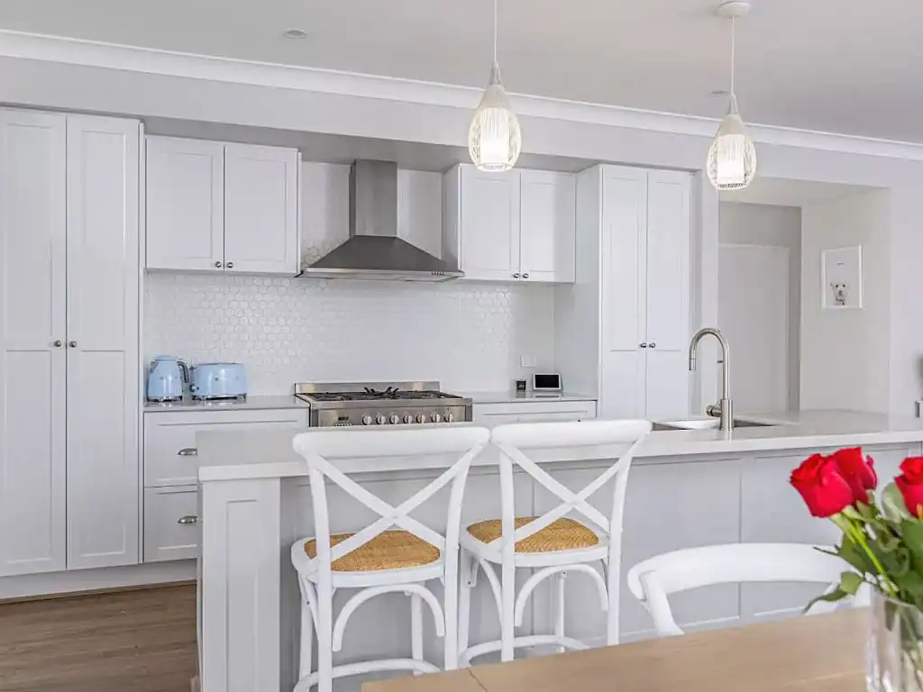Their fresh and contemporary take includes a Caesarstone Deluxe benchtop in Alpine Mist, and Laminex FormWrap Settler cabinetry in Polar White and Oyster Grey as a nod to the long-adored shaker style cabinetry found in traditional Hamptons homes.